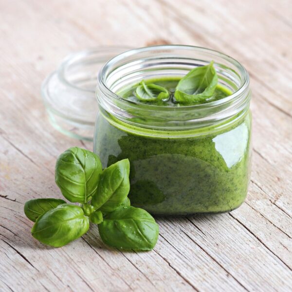 Pesto is a delicious and much loved sauce “crudo” (raw) made from Genovese Basil, a cultivar of sweet basil named for the city of Genoa, in beautiful Northern Italy. This traditional recipe, whose predecessor originates from the Roman Empire, also includes pine nuts, minced garlic, Pecorino Romano or Parmigianino Reggiano grated hard cheese, and olive oil.